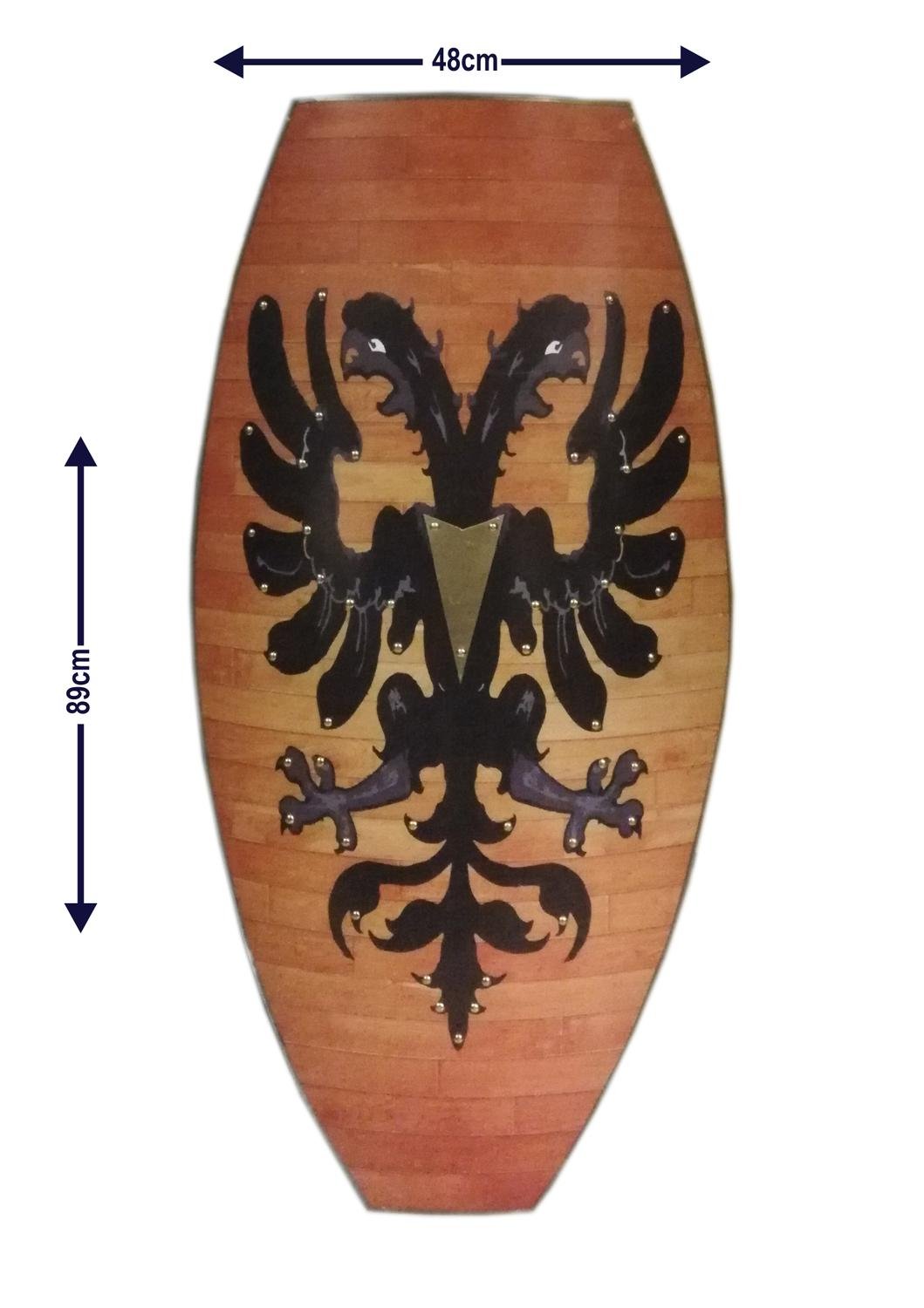 Funktioner: Lädergrepp och rem, bakhängande bälte. skölden kan hängas på en vägg med den medföljande kedjan.